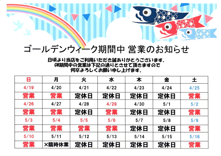 2026年GW期間中の営業予定です。ご来店の際はご予約をお願い致します。